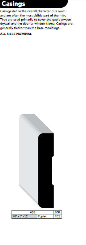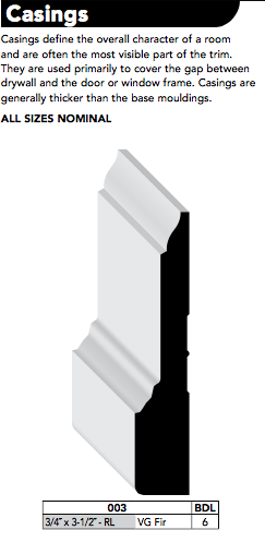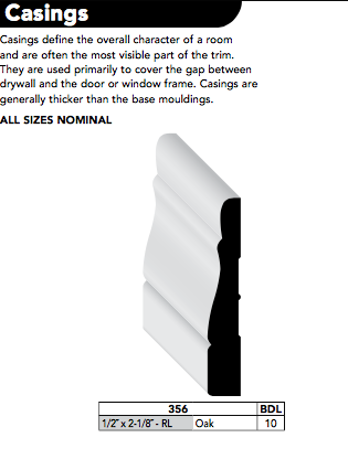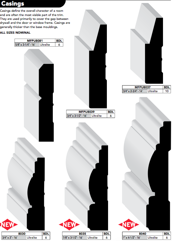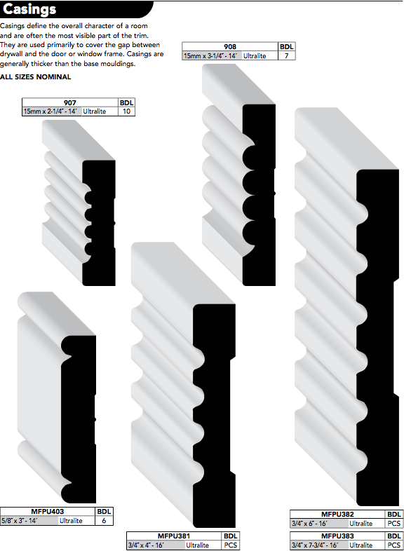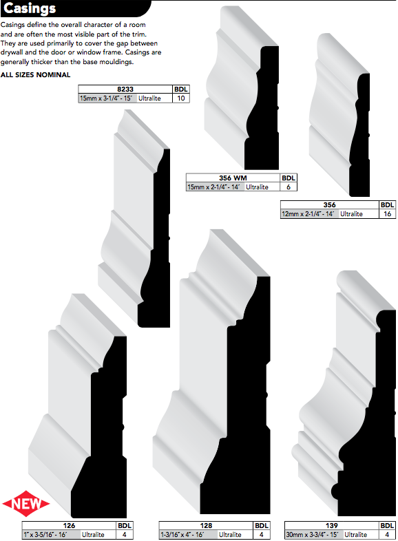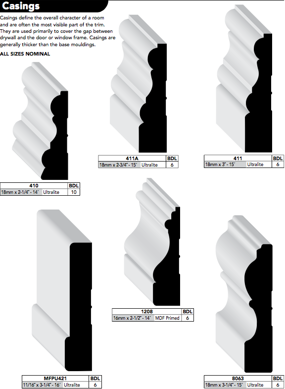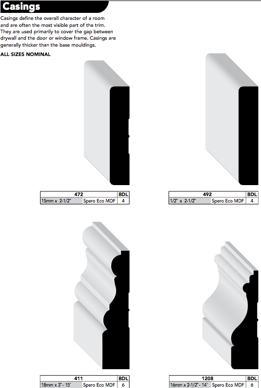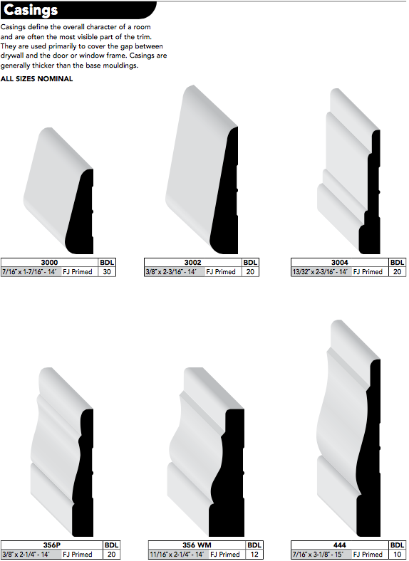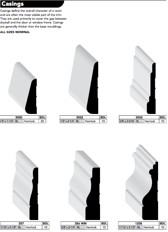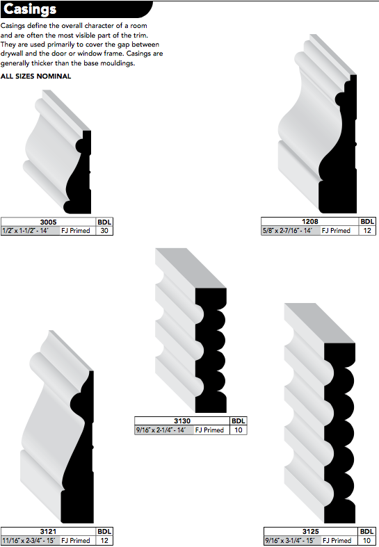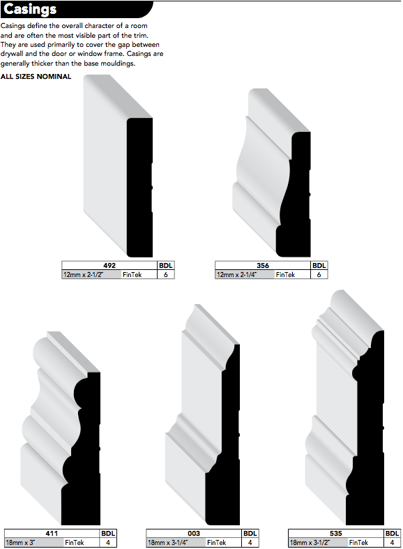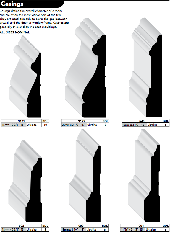 Casings define the overall character of a room and are often the most visible part of the trim. They are used primarily to cover the gap between drywall and the door or window frame. Casings are generally thicker than the base mouldings.