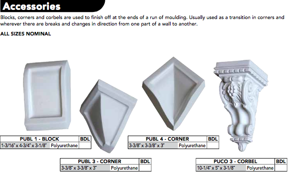 Blocks, corners and corbels are used to finish off at the ends of a run of moulding. Usually used as a transition in corners and wherever there are breaks and changes in direction from one part of a wall to another.